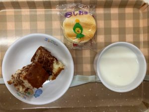 牛乳、マーブルケーキ、せんべい