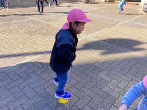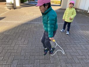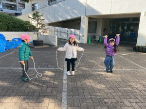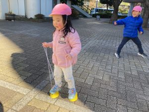 製作が終わってから、園舎前で遊びました✨縄跳びやぽっくりが大人気でした‼その他、鬼ごっこも楽しんでいましたよ☺ 寒さに負けず、元気いっぱい身体を動かして遊びました‼