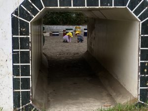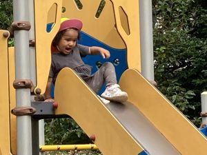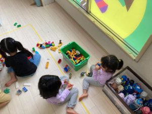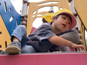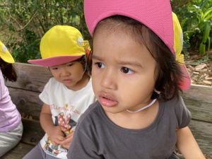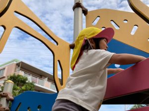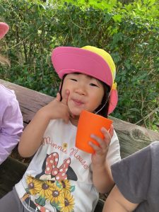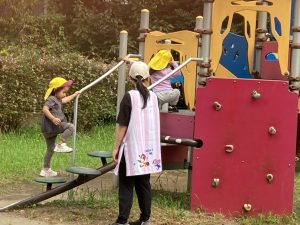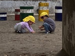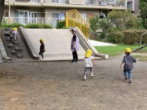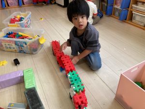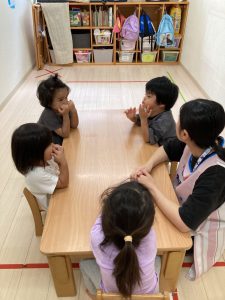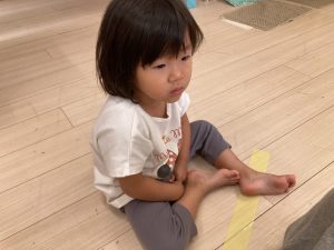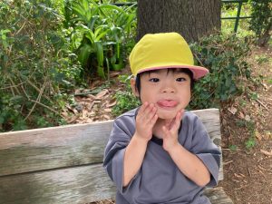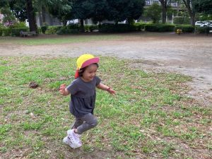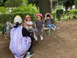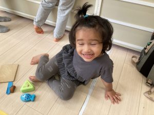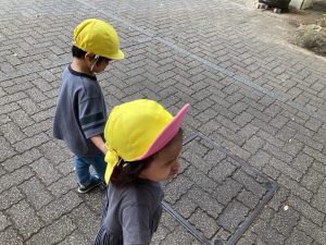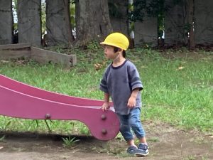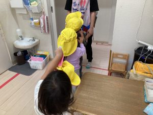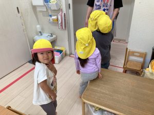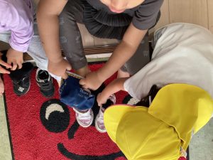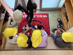 外遊びに出かける仕度では、自分で帽子をかぶろうとする姿や靴下をはこうと頑張る姿が、たくさん見られるようになりました。