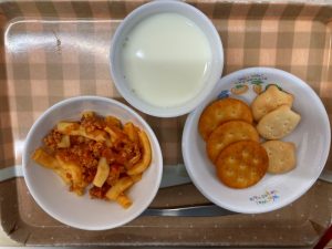 牛乳、ミートマカロニ、クラッカー