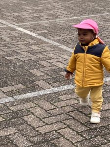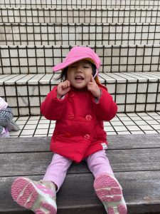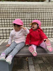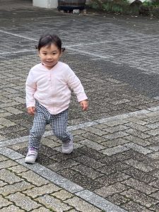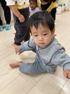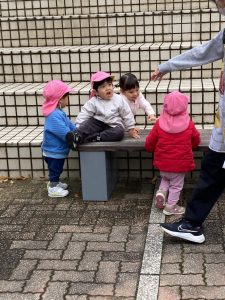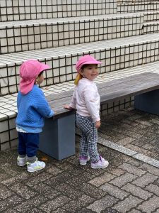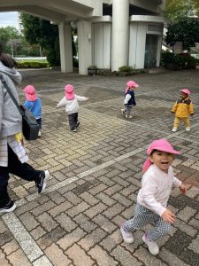 英語教室の前にスカイタウン内をお散歩し園舎前広場で追いかけっこをしたりして楽しくて遊びました!