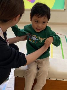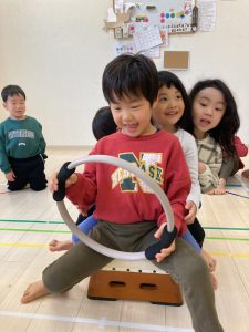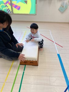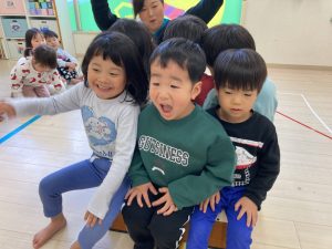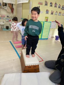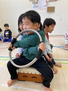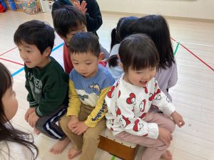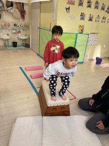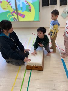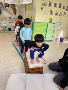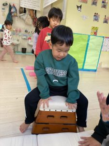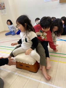 跳び箱に慣れる為に、跳び箱に何人座れるかを試したり、車に見立ててみんなで乗って楽しみました❣