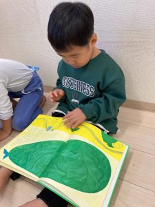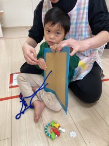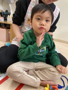 朝の会で同じグループのお友達に、名前を教えるお手伝いをしている場面です❣可愛らしい姿ですね(*^▽^*)