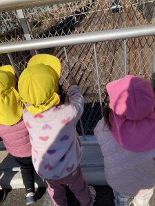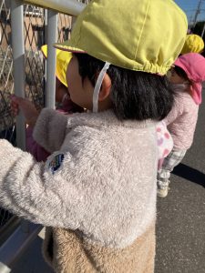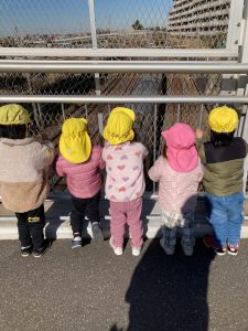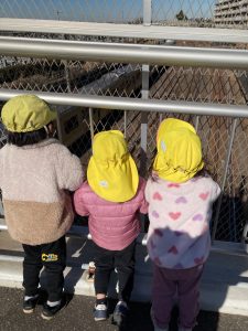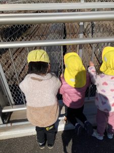 「電車おいでー!」などと電車を待っていると青色や黄色の電車がたくさん通りました‼電車が通るたび、ぴょんぴょん跳ねてとても嬉しそうでしたよ✨