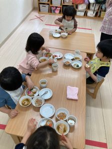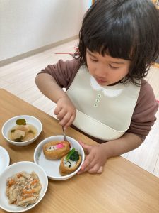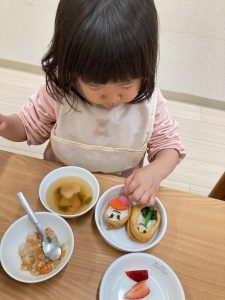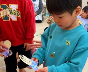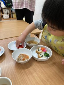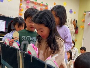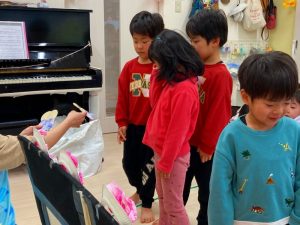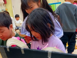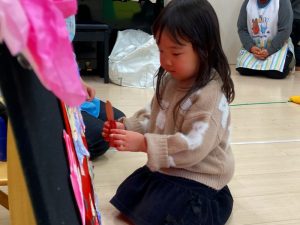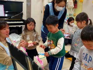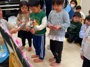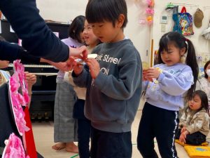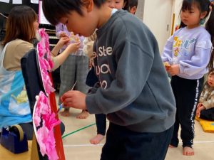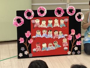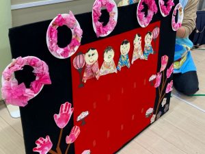 その後はちゅうりっぷ・すみれ組さん、たんぽぽ組さんが作った飾りに、さくら組さんが作ったひな人形を自分たちで飾りつけしましたよ。