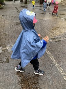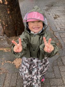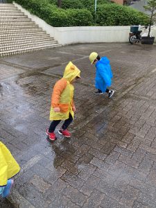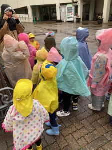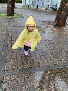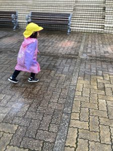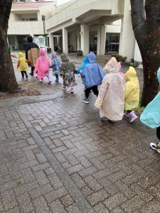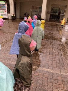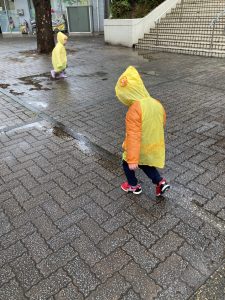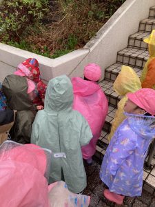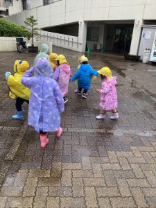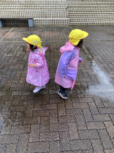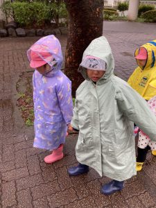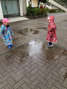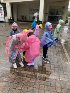 その後たんぽぽ組さんは、レインコートを着てさくら組さんと一緒に園舎前で遊びました!
