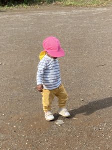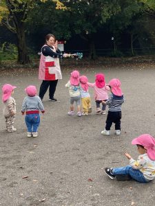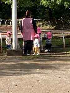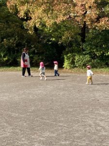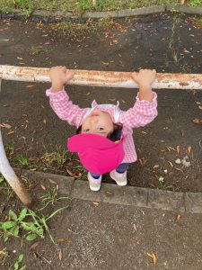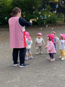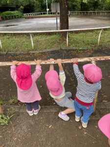 みんな自由に散策をしたり、シャボン玉を追いかけたり、柵にぶら下がって遊んだりして体をたくさん動かしました。