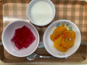 牛乳、手作りぶどうゼリー、かぼちゃのクッキー