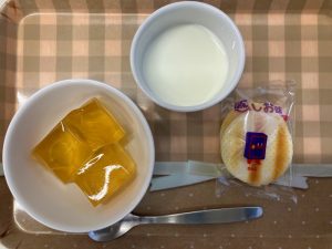 牛乳、りんごゼリー、せんべい