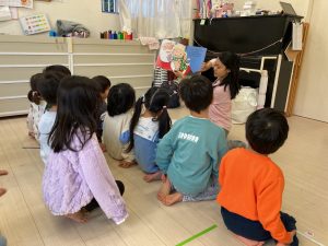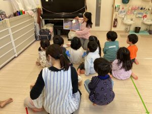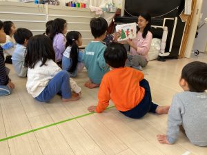 今日は、食べ物やクリスマスの単語を教わりました🎄絵本にも興味を持って目を向けていました。楽しい英語の時間でした🎵