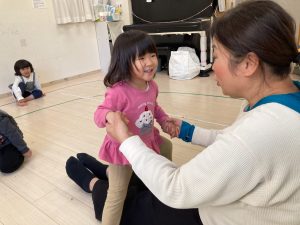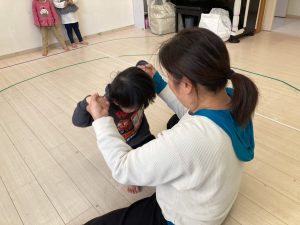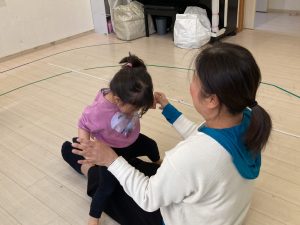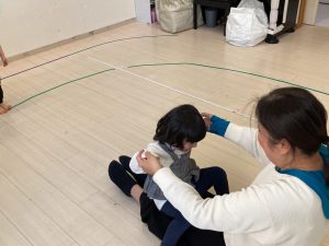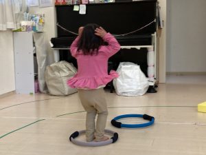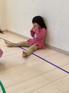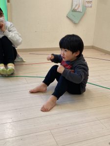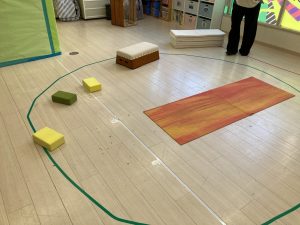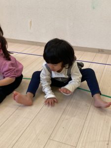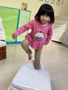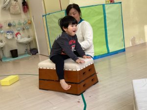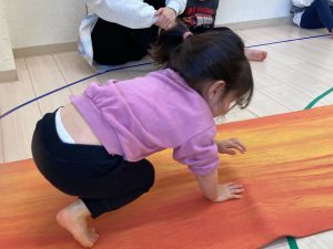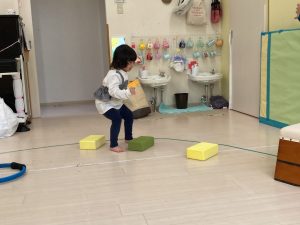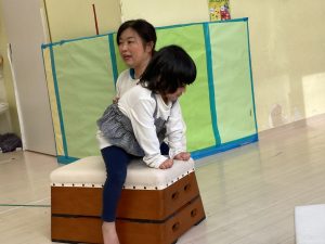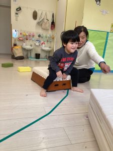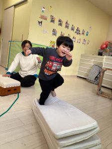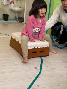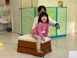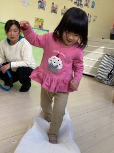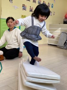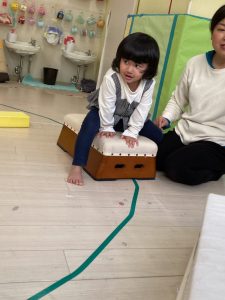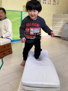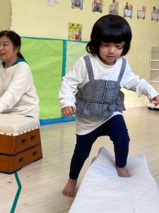 障害物をジャンプしたり、跳び箱に座って進んでみたり、最後はマットから落ちないように上手に歩いていましたよ(^▽^)/
