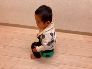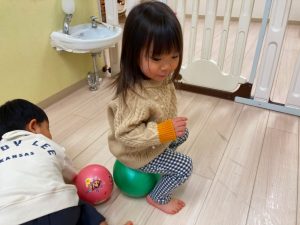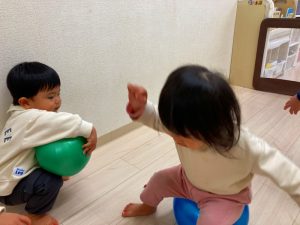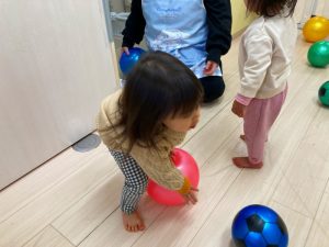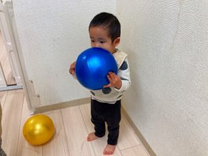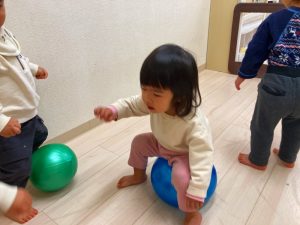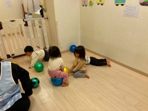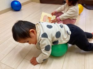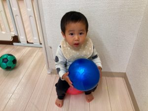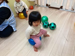 ボールの上に座って変顔をしたり、ボールの上にかぶさってゆらゆらしてみたり