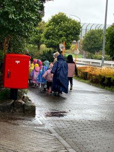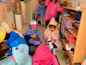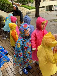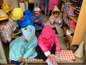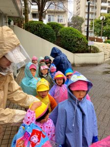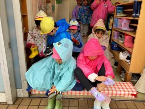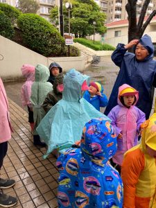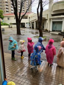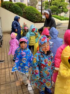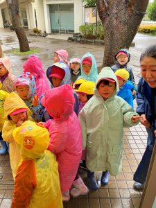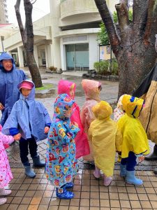 たんぽぽ組・さくら組は準備して頂いたレインコートを着て雨の日散歩をしました☔
